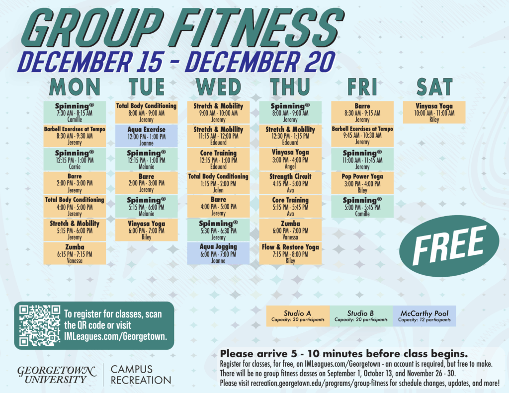 Group fitness classes are available, and free, to all Campus Recreation members. (Georgetown students are automatically enrolled in membership.)