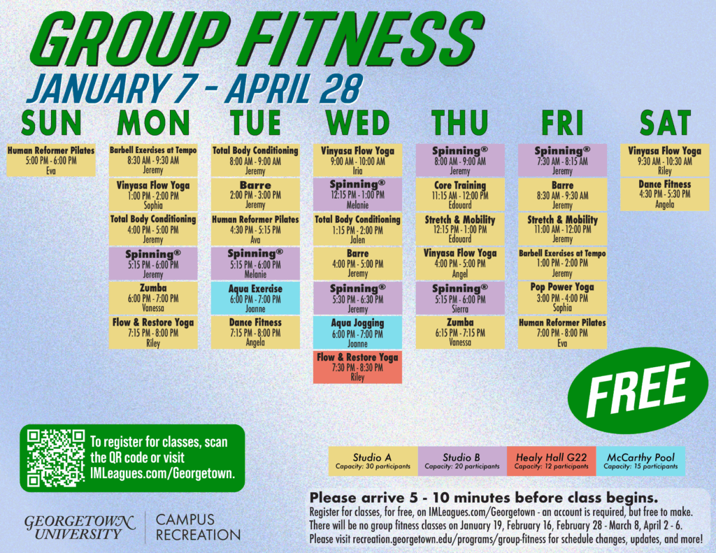Group fitness classes are available, and free, to all Campus Recreation members. (Georgetown students are automatically enrolled in membership.)